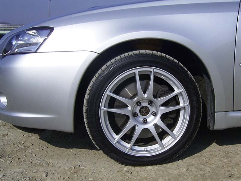 レガシィは、グレードに関係なく全てアルミホイールが標準装備となっています。 私の購入したGTでは、17インチのアルミホイールが標準装備となっていますが、足回りの軽量化を目的にアルミホイールを納車時に交換しました。 軽量ホイールと言えば、BBSの鍛造ホイールやスピードスターのSSR等がありますが、やはりお値段も高価です。 選ぶポイントとしては「(1)軽量である、(2)シンプルなスポークタイプ、(3)色はシルバーかガンメタ、(4)お値段もお手ごろ」等から選択しました。 そこで見つけたのがダンロップの「ディレッツァ アールエスシー(DIREZZA RSC)」です。 スッペックは「SIZE:17×7JJ、OFFSET:48、HOLE:5、PC.D:100 」で、色はレーシングシルバーを選択しました。 価格は購入店によって異なると思いますが、かなり安く購入できると思います。 さてホイールの重量差ですが、純正ホイールが確か8kg後半で、DIREZZA RSCは公証では6.5kgです。 つまり、4本で約10kgの軽量化が達成できていると思います。