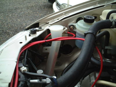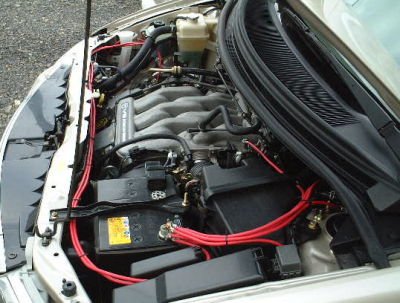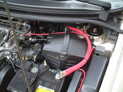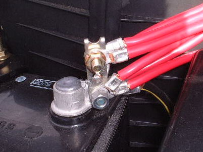 使用ケーブルは、KIV電線8sq 8m使用。耐熱80度なのでできるだけエンジ ンやラジエータからは遠ざけました。1200km走行にて全く異常なし。真夏は未 経験ですがそれほど耐熱に神経質になる事もなさそうです。 |
