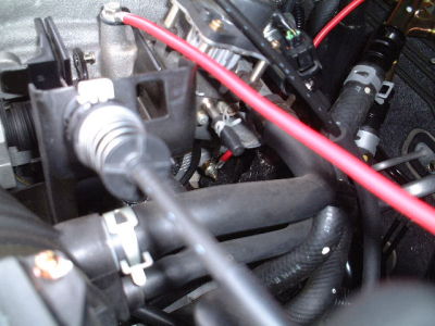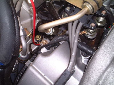 真中に見えるのが、ディストリビュータからの純正シールドアース線がエンジンブロックにアースされている部分です。 MPVではこの純正シールドアース線のデスビ側にアーシングするとエンジンがうるさくなるという例が多発。それでこちらにしました。 場所が深いので施工はやや困難ですがラチェット+エクステンションでなんとかOK。ネジは落すと厄介なので全部外してしまわず、丸端子の先を切って差し込みます。 |