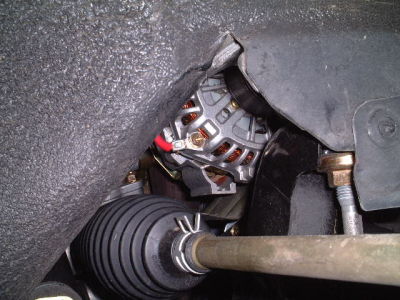 オルタネータはエンジン奥下にあるので、エンジンルームからは施工不可。 しかし、右タイヤハウスからのアプローチで割と容易にできました。 ハンドルを目いっぱい左に切っておけば、ジャッキアップも不用。 |