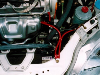 他のパイプ、ボンネットとの接触に注意すること。 その為、左右の渡りはタワーバーの下を通すこと。(かっこよくても上はダメ) (1)の線はウィンドウォッシャーを止めているカプラーの開いている左端を利用。 エンジンは前後5cmずつ振動します。余裕を持って下さい。 以上で有れば車検は通ります。