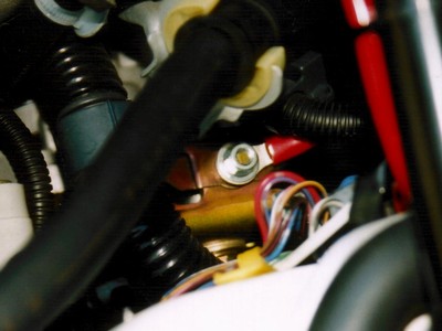 解りにくいのですが (2) オルタネーター上部のケーブル止め金具の上向きのボルトに共締め。 |