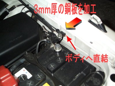 3mm厚の銅板を加工してバッテリーのマイナス端子とボディを直接接続しました。 |