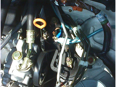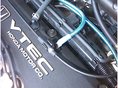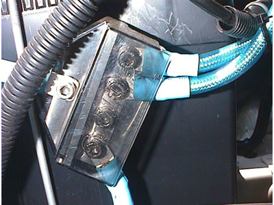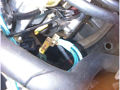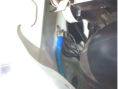自作ケーブルで、車両ハーネスからのボディーアースをエンジンマウント部アース線へとも締めしています。 |