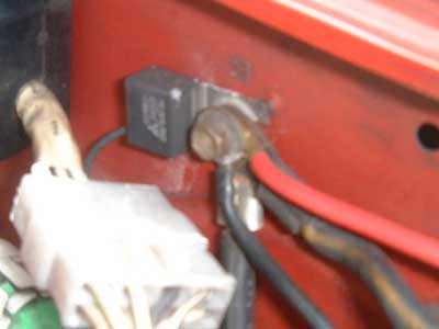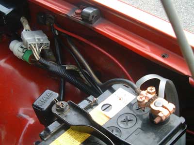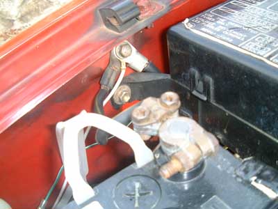 右側のバッテリーのマイナス端子です。端子は普通でアーシングしているようには見えません。 |