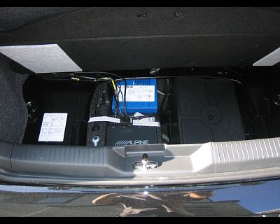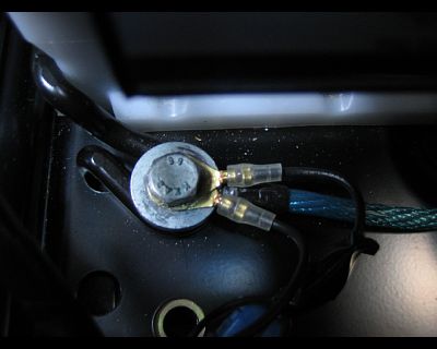 しかしながら本車輌は、ラゲッジスペース内にボディアースを取れるポイントが皆無であることから、やむなくバッテリーステーの固定ボルトに共締めしました。 |