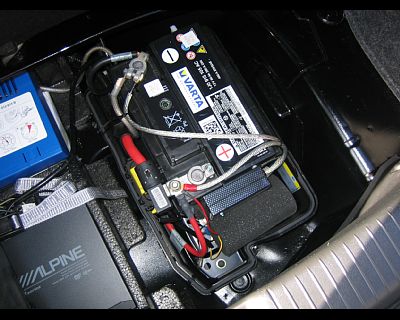Speedex L1はバッテリー後方側面に貼り付けていますが、分かりにくいですね。 そこから+/−の各ターミナルとSEEC用アースポイント(後述)に、各ケーブルを接続しています。 |