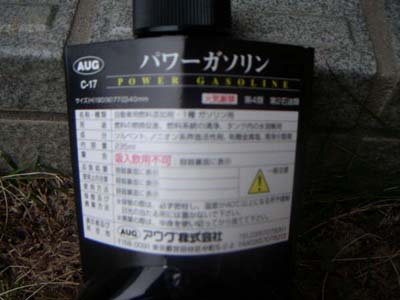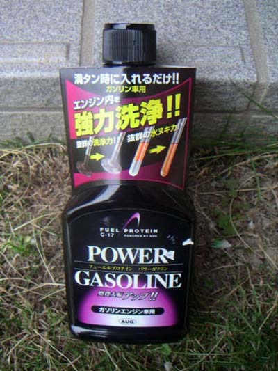 商品のパッケージにも、「(1)満タン時(ガソリン60L)に対し1本を燃料タンクに注入して下さい。1,000km走行毎のご使用が効果的です。(2)注入する時、ゴミや水等が入らないように注意してください。」と記入されております。 早速投入します。サラサラの液体ですので、ザバッと入ってしまいました。 |