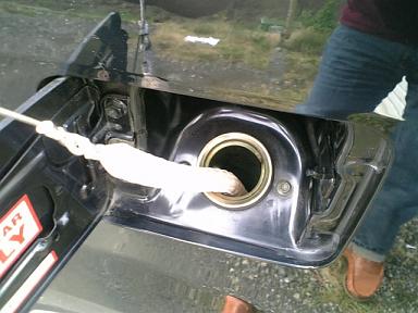 水道用のゴムホースを使い押し込みましたが、1m位押し込んだところでそれ以上入らなくなりました。 車下にもぐり、ガソリンタンク直前のホースを外すと貴宝石が見えたので、直接タンク投入を試みましたが入りません??? タンク入り口に指を入れると十字のフィルター(異物混入防止?)のようなものが付いていたので、このフィルターを取り外し貴宝石をタンクに投入しました。 |