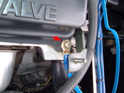 まずはダイレクトイグニッション取り付け位置を決めます。 端子をコイル鉄芯部分のボルトに共締めします。(赤矢印4箇所) 次にエンジンヘッド近辺にアースを配線します。(右下赤矢印) 配線はいたって簡単ですが、見た目を気にするなら、試行錯誤しながらの作業となり、若干時間がかかります。 |