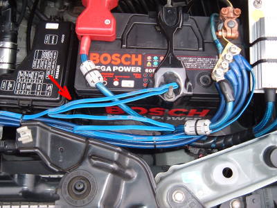 ここでも配線が長すぎます。どの車にも対応できるよう長めになっているのでしょうが、見た目がいまひとつです。 結局、適度な長さにカットしてバッテリーに接続しました。 |