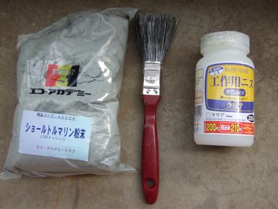 でも、それだけではつまらないので、マイナスイオン効果アップを目的に、トルマリンペイントを銅板に塗布する事を考えてみました。 ただ、トルマリンペイントを購入するとなるとかなりの高額になりますので、トルマリンパウダー(ショールトリマリン、粉末)をネットショップ「ユニラック」より購入し、この粉をニスに分散させ銅板に塗布する自作トルマリンペイントを作成してみました。 ニスおよび刷毛はダイソーより購入。 これで1,500円程度のトルマリンペイント(しかも粉は大量に余りました)の完成です。ルンルン気分で塗布してみると・・・なんと、銅板表面ではじいてしまってうまく塗布できませんでした。 そこで、台所洗剤を微量添加し、様子をみながら表面張力を下げてなんとか塗布しました。 (フー焦りました・・・) |