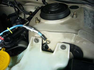 私が考えるところ、BHランカスターはココはベストポイントです。 なぜなら、ここにはディーラー純正でエンジンアースが取り付けられいる、つまりここに共締めしたら、エンジンブロックにアース繋げるのと同じ効果、更にココなら熱の心配がほとんどありませんし、バッテリーにも近いし、言うことありませんね。 |