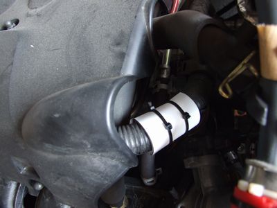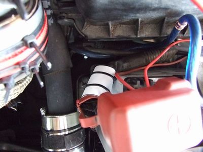 写真のように、丸めたシートをタイラップ2個で固定。このタイラップはダイソーで購入しました。 後でメーカーに問い合わせたところ、赤いカバーに取りつけても効果があるとの事。ここならどの車でも装着は容易と思います。 |