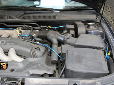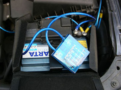 車内への配線は不要で付けてしまえば勝手に仕事してくれます。 携帯電話2個分くらいの大きさでジャマにならないし、ボンネットを閉めてしまえば外からは分かりません。 |