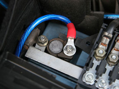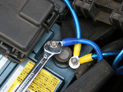 取り付けには次写真のように10mmレンチが必要ですが、これ1本あればアースケーブルを含め全ての作業ができます。 ケーブルがベルトや冷却ファンに絡まない位置に。 |