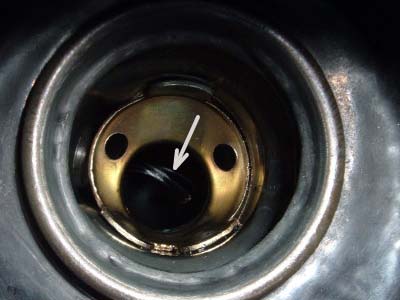 リングがパイプの中まで入って取り出せない状態に! (写真矢印部)。 悪戦苦闘すること約10分、漸くエコボルタ本体を給油口から取り出しました。 |
