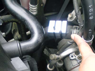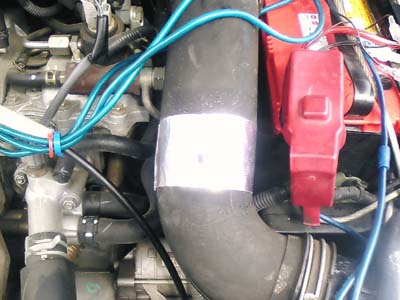 貼り付けは裏紙を剥がして貼るだけですが、熱で剥がれない様にインテークホースの真っ直ぐな部分に貼るのが良いようですね。 |