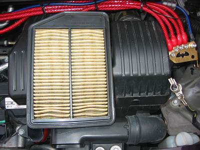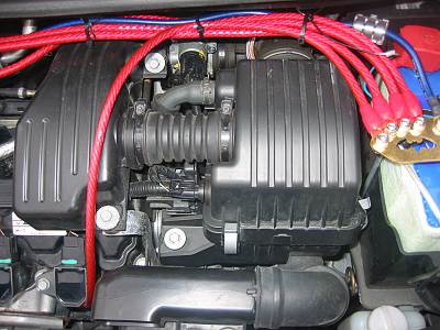 エアクリBOXのフタ側にダクトが、自分は詳しくないのですが、エンジン側に行くのと、隣の消音用BOXにいくのの二本出ております。 エアフローセンサーらしきものも(温度計測用かも) BOX自体は4隅に留め金がついていてこれを外すだけでいいのですが、非常に手が入り難い場所にもあります。 ん〜狭い・・流石軽ですね。 とりあえずバッテリを撤去してみることにしました。 |