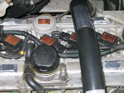 いろんなところに貼り貼りしてあります。 ヘッドカバーを塗装するために外したついでに3枚重ねで貼りつけました。 |
