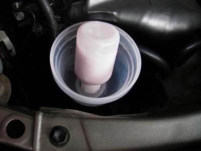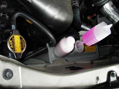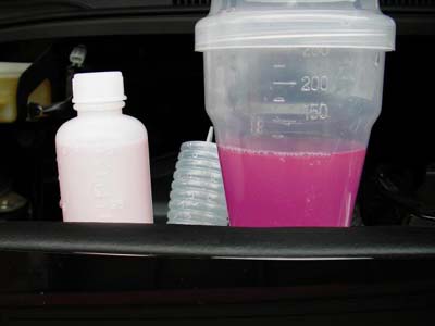 全部がすっきり入りませんでした。残りはリザーブタンクに戻して終了です。 「みどりタイヤ」さんに聞きましたが、出来るだけラジエーターキャップからの投入が良いそうです。 リザーブタンクだと沈殿する場合が多いそうなので、効果が出にくい場合があるので要注意です。 |