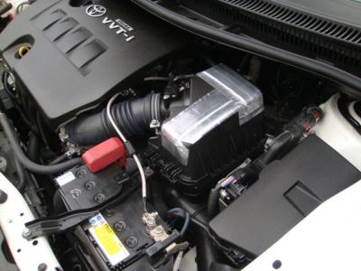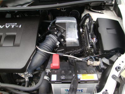問題ないとは思われますが、長期間の使用により万が一にも内容物の漏れ等があった際にエンジンへの侵入を防ぐ意味で、フィルターより外気側への設置にしました。 ボックスの大きな車両だと、もっと容易に設置できるでしょう。 |