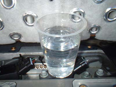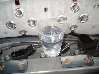 その状態で水を入れたコップを置いて、暖気後のエンジンの振動を見たところです。 ※【SEV】のホームぺージに載っていたので、インスパイアしてみました。(笑) |