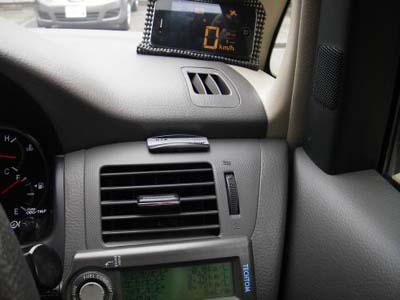 音響効果の向上と、冷風・温風の噴出し口に近づけた事によって、室内の空調にもイオン効果を期待しました。 右上には、三角窓近くに「iPhone 4」を置いて、HUD(ヘッドアップディスプレイ)として使用しています。 昼間は、フロントガラスに反射させては使用出来ませんので、滑り防止マットで包んで直に立て掛けています。 |