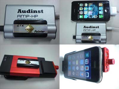 ヘッドフォンアンプへ「ピンポインターKING」を貼り付けました。 上段:Audinst社のヘッドフォンアンプ「AMP-HP」、iPhone 4 や他のMP3プレーヤーへ接続使用しています。 下段:旧式iPhone 3GS には、ベンチャークラフト社のバッテリ内蔵ヘッドフォンアンプ「Go-Dap!」に合体して使用しています。 |