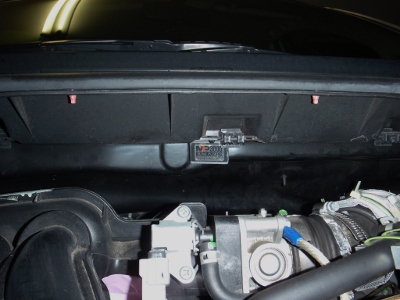 名称がよくわかりませんが、エンジンルームの正面中央、フロントウインドウの下側に貼りました。 |