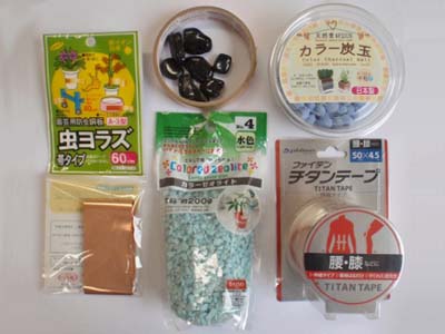 右上からダイソーのカラー炭玉、その下がファイテン チタンテープ。 |