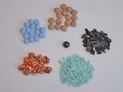 左の青いボールがカラー炭玉、時計回りにチタンテープ。 |
