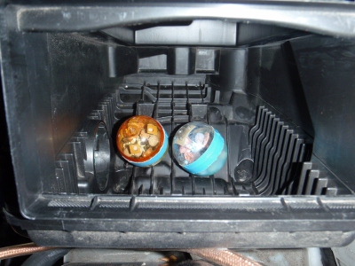 エアクリーナーボックスにフィルターをセットするときに、ガチャガチャが邪魔になってセットしにくかったので、容器を変更するために取り出しました。 カラー炭玉の粉と思われるものが出て、内側がうすい青色に染まっています。 |