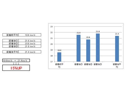 装着前が18.5km/L、装着後が20.73km/L(3回平均値)、約12%の向上。 というか、もともと18km/Lも走っていたのに、そこからの伸びしろに驚きです。 |