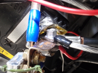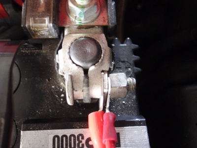 プラス端子にはMP3000 Power BOX-SCのコードがつないであるので、その横にはさみました。 |