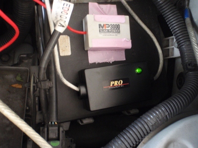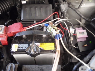 バッテリー上面はスペースがないので、コードを伸ばして本体をヒューズボックスに貼り付けました。 |