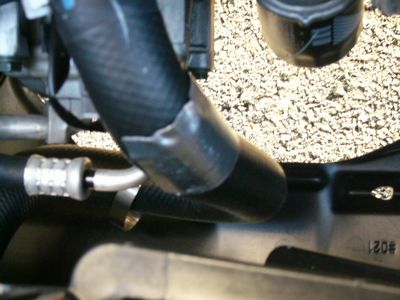 エンジン内の場所は、一緒に写っているラジエターキャップの位置で想像がつくかと思いますが、メーカーによっては違うかもしれませんので、後で、エンジン全景も載せておきます。 また、装着における注意点ですが、エンジン停止時はホースは大気圧となっている為、締め過ぎには注意します。(気にせずしめ続けると、ホースが変形するほど締まってます。) ホースの半周しかチップが無いという事で、形状がいびつな事と、金属同士の閉めつけなので、緩過ぎると脱落の危険もあり、この加減は難しいです。 装着後は、何度か確認したほうがいいと思います。 |