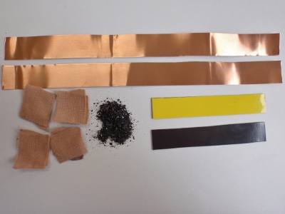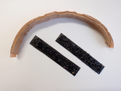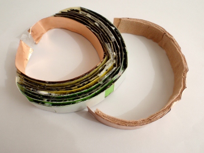 内側になる虫ヨラズに2枚ずつトルマリンシートを貼り付けて、それを8回繰り返します。合計16枚使います。 ボンドだけでは接着力が弱いので、両面テープとボンドの併用です。 曲面に仕上げたいので芯になるペットボトルのようなものに巻きつけて貼ってゆきます。 トルマリンシートの一番外側にはまだ両面テープの紙がついています。 右側がチタンシート8層です。 |