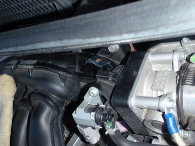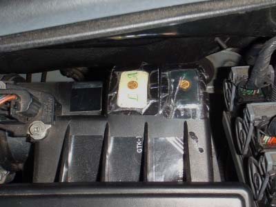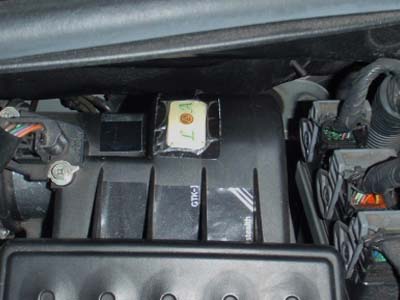 サージタンクに貼っていたのをはがし、エアクリーナーボックスの外側、上方、既に貼ってあるとなりに貼り付けました。 |