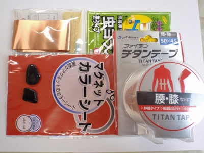 上から、虫ヨラズ、右がファイテンのチタンテープ、左がマグネットカラーシート、その上に載っているのがトルマリン石です。 |