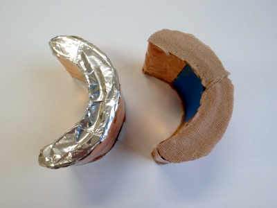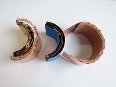チタンシートは虫ヨラズに木工用ボンドを塗り、チタンテープを貼ってゆきます。はみ出たのははさみで切ります。 チタンテープは6層重ねです。これが一番外側になります。 トルマリンシートは3層プラス内側のマグネットシートです。 貼り合わせると設計通りいかず、両端が少し余ったのでニッパーでカットしました。 一番左は、チタンシートの内側にボンドを塗ってトルマリンシートを貼り合わせたものです。 チタンシートの余った虫ヨラズを内側に織り込んで、これもボンドで貼り付けます。 |