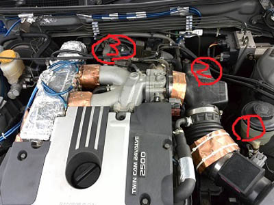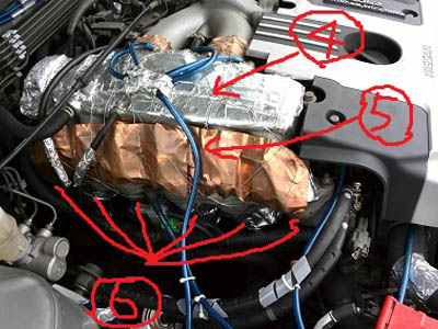 このトルマリンベルトは(1)エアフローメーター後部ダクト、(2)スロットルチャンバー前部、(3)インテークマニホールド(アッパー)(2本)、(4)インテークマニホールドコレクター上面、(5)インテークマニホールド側面、(6)インテークマニホールド(6本)、の計(1)から(6)の全部に巻いたり、一部を外してみたり、あらゆる組み合わせを試しました。 |