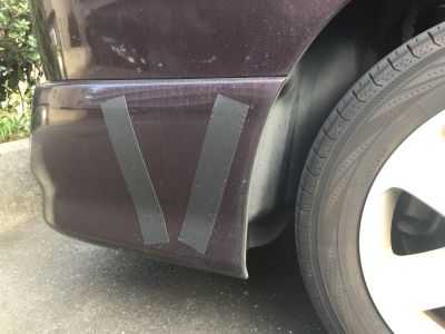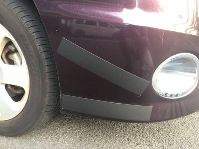 トヨタの86等で有名な、アルミテープで特許を取ったという記事等を参考に、バンパーに貼りました。(見栄えは内側に貼るのが良いのだと思いますが、貼り易さの面で外側に貼ることにしたため、ボディ色に対し目立ちにくい黒いテープにしました。目立ちますが。。) |