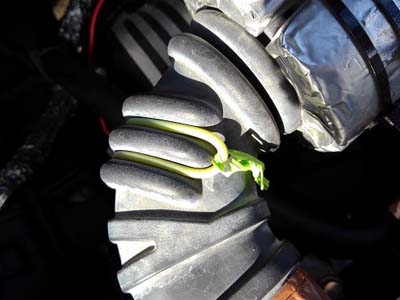 シリコンゴム製のブレスレットの細いものを1本、空気取り入れ口からエアクリーナーボックスに行くパイプの曲がり角に巻き付けました。 |