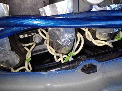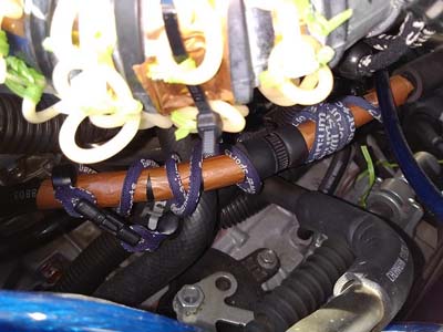 サージタンクからエンジンに行くパイプに、シリコンネックレス×3をタイラップに巻き付けてから固定しました。 |