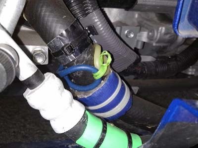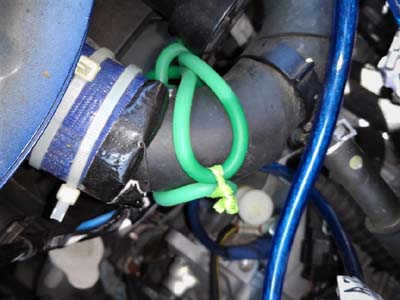 ラジエターアッパーホースにシリコンブレスレット太×2をつないで巻き付けました。 |