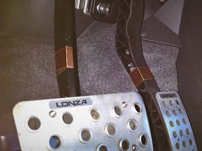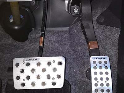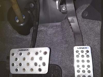 当たり前ですが、右がアクセルペダル、左がブレーキペダルです。ペダルには滑り止めのカバーを取り付けています。 |