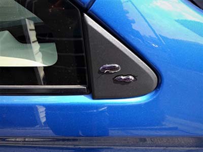 今の車は三角窓はありませんが、三角窓があると思われるフロントウィンドウの先の樹脂部分に貼りつけました。 |