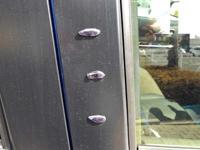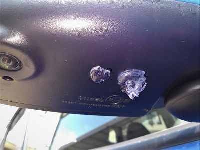 とりあえずフロントウィンドウのピラーの下の方に3個貼り付けました。 |