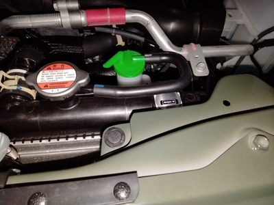 装着事例として、ラジエーターに貼っていることが多いと思いましたので、アッパータンクの上に装着しました。 |